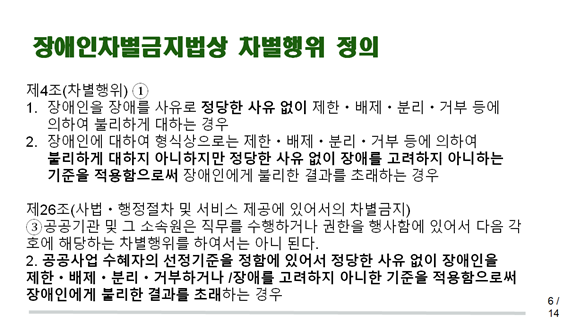 | | | 6. Àå¾ÖÀÎÂ÷º°±ÝÁö¹ý Á¦4Á¶ Á¦1Ç× Á¦1È£¿¡¼´Â Àå¾ÖÀÎÀ» Á¦ÇÑ, ¹èÁ¦, ºÐ¸® °ÅºÎÇÏ´Â Á÷Á¢ Â÷º°ÇàÀ§¸¦ ±ÔÁ¤Çϰí ÀÖ°í, Á¦2È£¿¡¼´Â °Ñº¸±â¿¡´Â ºÒ¸®ÇÏ°Ô ´ëÇÏÁö ¾Æ´ÏÇÏÁö¸¸ Àå¾Ö¸¦ °í·ÁÇÏÁö ¾ÊÀº ±âÁØÀ» Àû¿ëÇÏ¿© ºÒ¸®ÇÑ °á°ú¸¦ Ãʸ®ÇÏ´Â °£Á¢ Â÷º°ÇàÀ§¸¦ ±ÔÁ¤Çϰí ÀÖ½À´Ï´Ù. °°Àº ³»¿ë¿¡ °üÇÏ¿© Á¦26Á¶ Á¦3Ç× Á¦2È£¿¡¼´Â °ø°ø»ç¾÷ ¼öÇýÀÚ ¼±Á¤±âÁØ¿¡ °üÇÏ¿© Â÷º°±ÝÁö Àǹ«¸¦ ºÎ°úÇϰí ÀÖ½À´Ï´Ù.