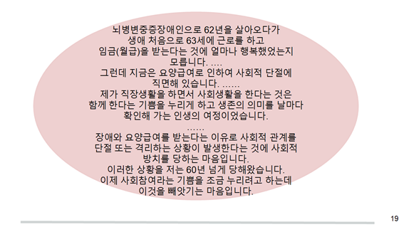 | | | 16. ÀÌ »ç°Ç ÁöħÀÌ °³Á¤µÇ¾ú±ä Çϳª ÇöÀçµµ ¿©ÀüÈ÷ ³ëÀÎÀå±â¿ä¾çÀÎÁ¤ÀÚ¿¡°Ô¸¸ ´Ù¸¥ Àå¾ÖÀε鿡°Ô´Â ¿ä±¸ÇÏÁö ¾Ê´Â ÀýÂ÷¸¦ ¿ä±¸Çϸé¼, Àå¾ÖÀÎÀÏÀÚ¸® »ç¾÷¿¡ ÀÏÇÒ °æ¿ì Àå±â¿ä¾ç ÀûÁ¤¼ºÀ» Àç½É»çÇÒ °ÍÀ̶ó´Â »ç½Ç»ó Çù¹Ú¿¡ °¡±î¿î ³»¿ëÀ» ±âÀçÇϰí ÀÖ¾î, ³ëÀÎÀå±â¿ä¾çÀÎÁ¤ Àå¾ÖÀθ¸À» ºÒÇÕ¸®ÇÏ°Ô Â÷º°ÇÏ´Â Â÷º°ÇàÀ§´Â °è¼ÓµÇ°í ÀÖ½À´Ï´Ù. |