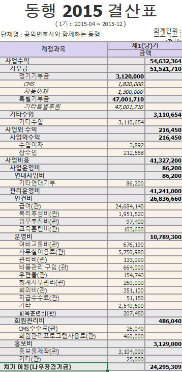 ȨÆäÀÌÁö¸¦ ÀÌÀüÇÏ´Â °úÁ¤¿¡¼ Á¾Àü ȨÆäÀÌÁö¿¡ ÀÖ´ø ÀÚ·áµéÀÌ Á¦´ë·Î ¿Å°ÜÁöÁö ¸øÇÑ Ã¤ ´©¶ôµÇ¾ú±â¿¡ ´Ê¾úÁö¸¸ ´Ù½Ã 2015³âµµ µ¿ÇàÀÇ °á»ê ÇöȲÀ» ¿Ã¸³´Ï´Ù. Â÷±â ÀÌ¿ù±ÝÀÌ ¸¹Àº ÀÌÀ¯´Â 2³â°£ Áö¿øµÇ´Â ³ª¿ì °ø°¨±â±ÝÀÌ 6°³¿ù¿¡ Çѹø¾¿ ÀԱݵDZ⿡ ¹«¾ð°¡ ¸¹ÀÌ ³²Àº °Íó·³ º¸ÀÌÁö¸¸ »ç½Ç Àú ±â±ÝÀº 2016³âµµ »ó¹Ý±â »ó±Ùº¯È£»çÀÇ ±Þ¿©·Î Áö±ÝµÉ °ÍÀÌ 2015³â 11¿ù¿¡ Áö±ÞµÇ¾ú±â ¶§¹®ÀÔ´Ï´Ù. °á·ÐÀº ³²´Â ÀçÁ¤ÀÌ ¾Æ´Ï¶ó´Â ¶æ. ^^;;;